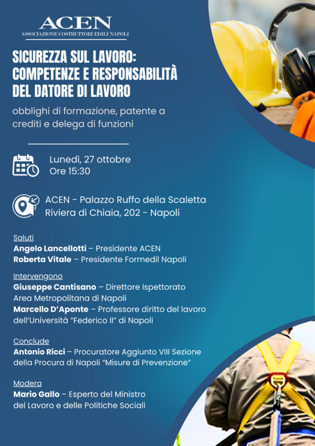 La S.V. è invitata a partecipare al convegno dal titolo "Sicurezza sul lavoro: competenze e responsabilità del datore di lavoro - Obblighi di formazione, patente a crediti e delega di funzioni", che si terrà lunedì 27 ottobre alle ore 15:30 presso la sede dell'Acen (Palazzo Ruffo della Scaletta, Riviera di Chiaia, 202 – Napoli).