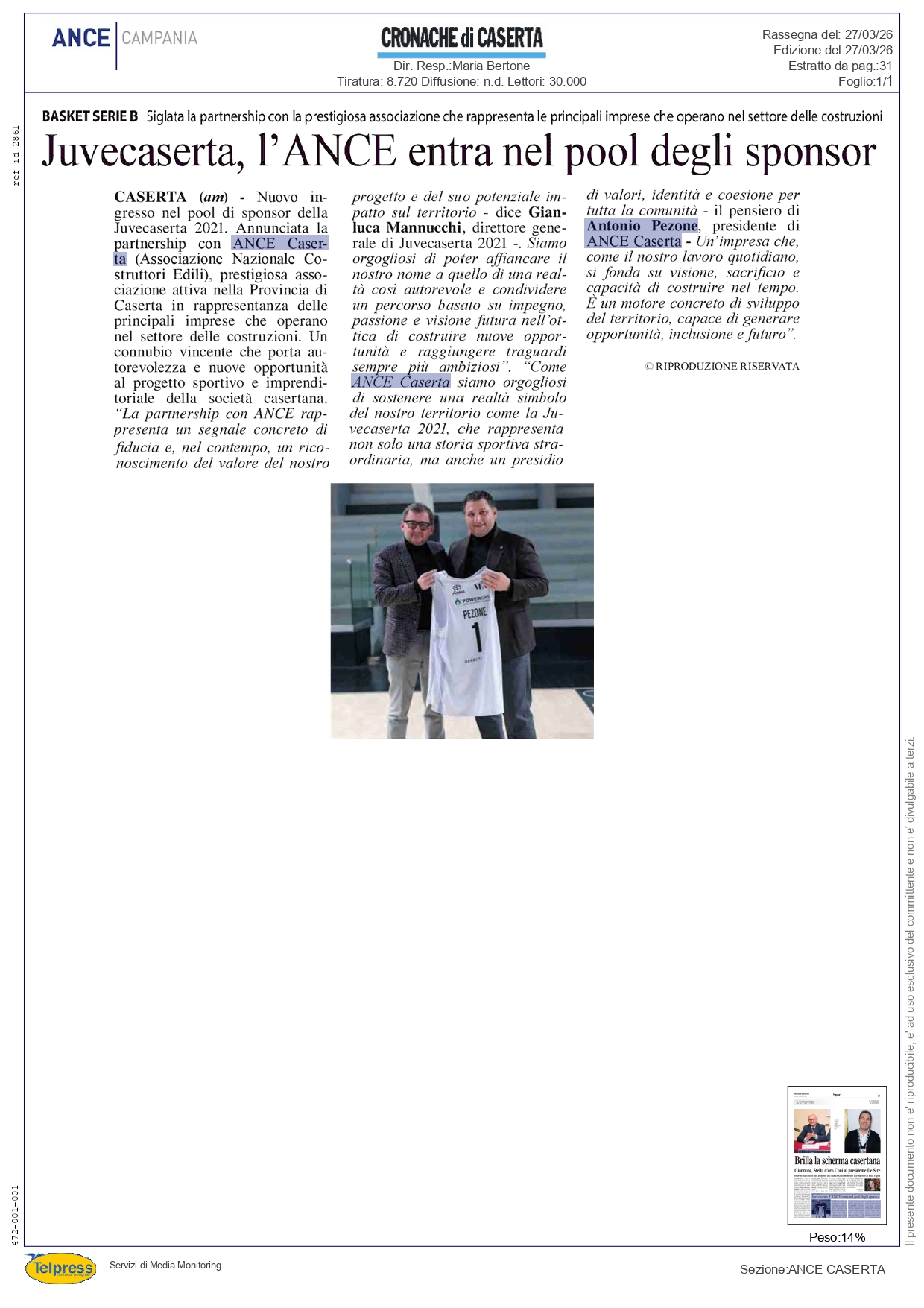 Juvecaserta, l'ANCE entra nel pool degli sponsor